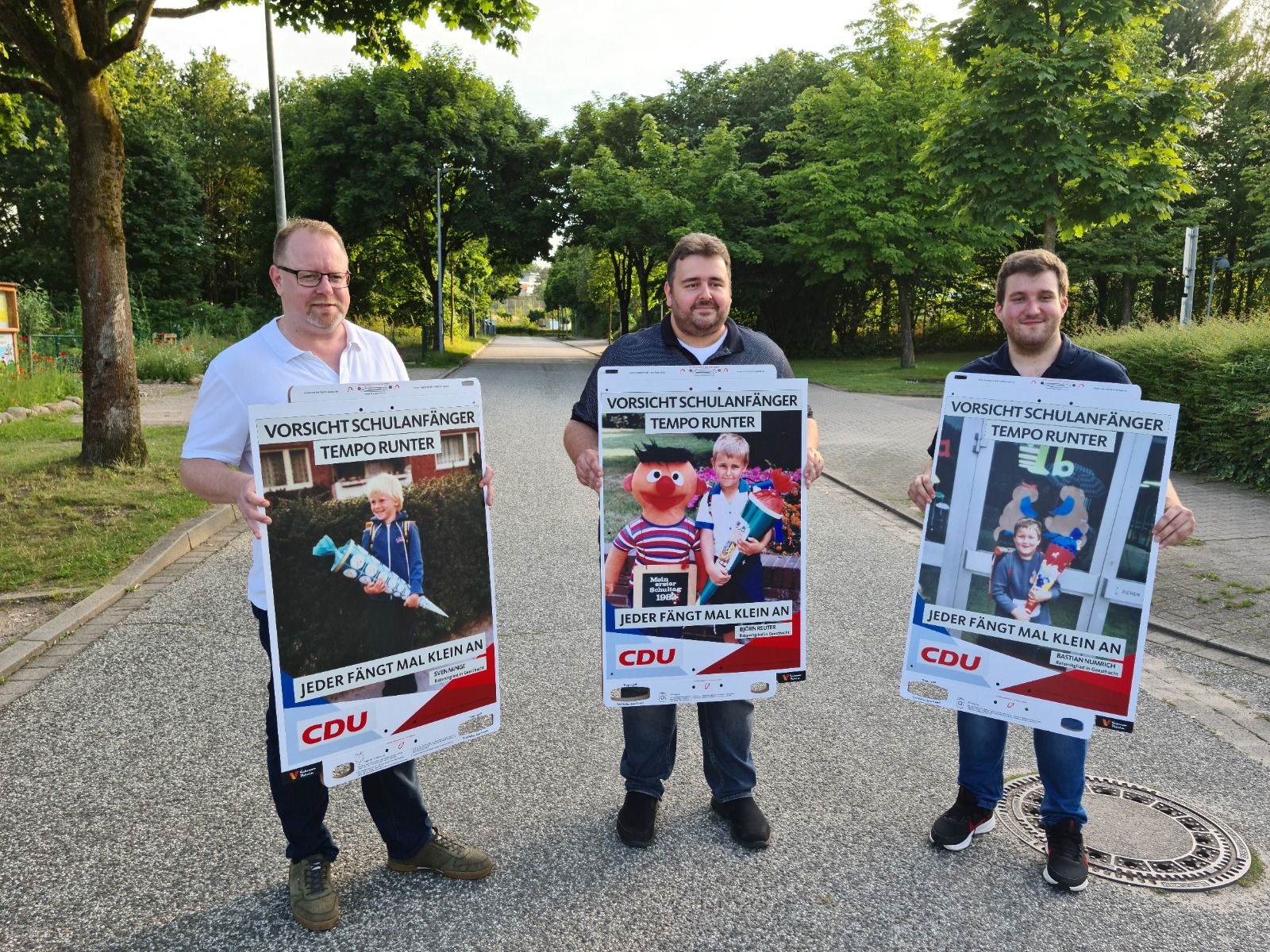 Schon im Jahr 2003 startete die Junge Union die Kampagne“ Vorsicht Schulanfänger – Tempo runter“. Für diese Tradition hat der CDU Ortsverband nun schon im 3. Jahr eigene Plakate erstellt. Der besondere Hingucker: Die abgebildeten Schulkinder sind die Geesthachter CDU Ratsmitglieder Bastian Numrich, Björn Reuter, Sven Minge und Jessica Woehr an ihrem eigenen Einschulungstag!