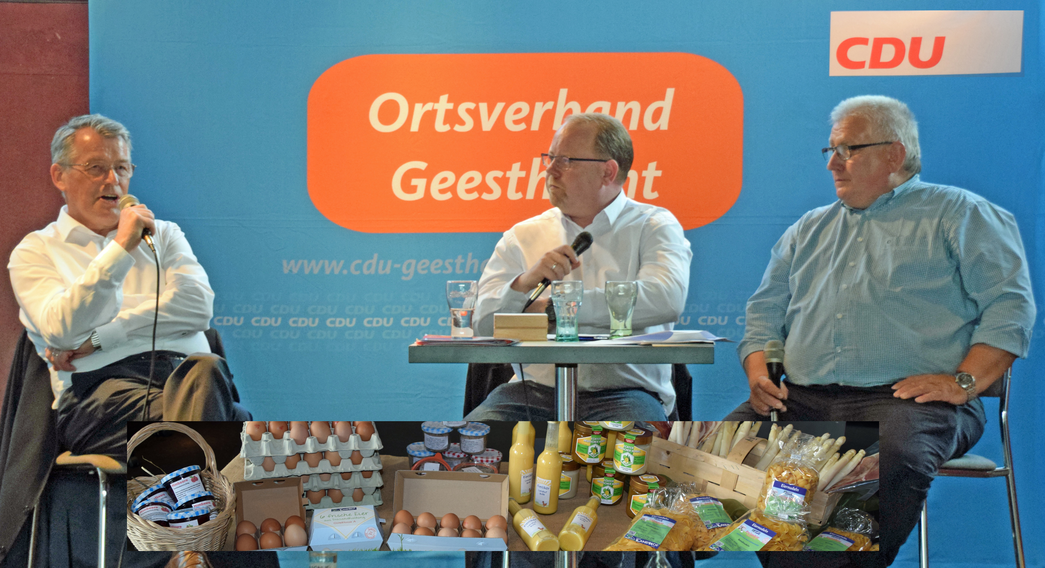 Zur Diskussion "Regionale Ernährung" hatte die CDU-Geesthacht am Freitagabend in das Mehrgenerationshaus Oberstadttreff eingeladen. Reimer Böge, Mitglied des Europäischen Parlaments (MdEP) und selbständiger Landwirt, diskutierte auf dem Podium mit Klaus Schlie, dem Präsidenten des Schleswig-Holsteinischen Landtages (MdL) und CDU-Kreisvorsitzenden. Die Moderation hatte Sven Minge, der Vorsitzende der CDU-Fraktion im Rat der Stadt Geesthacht, übernommen.