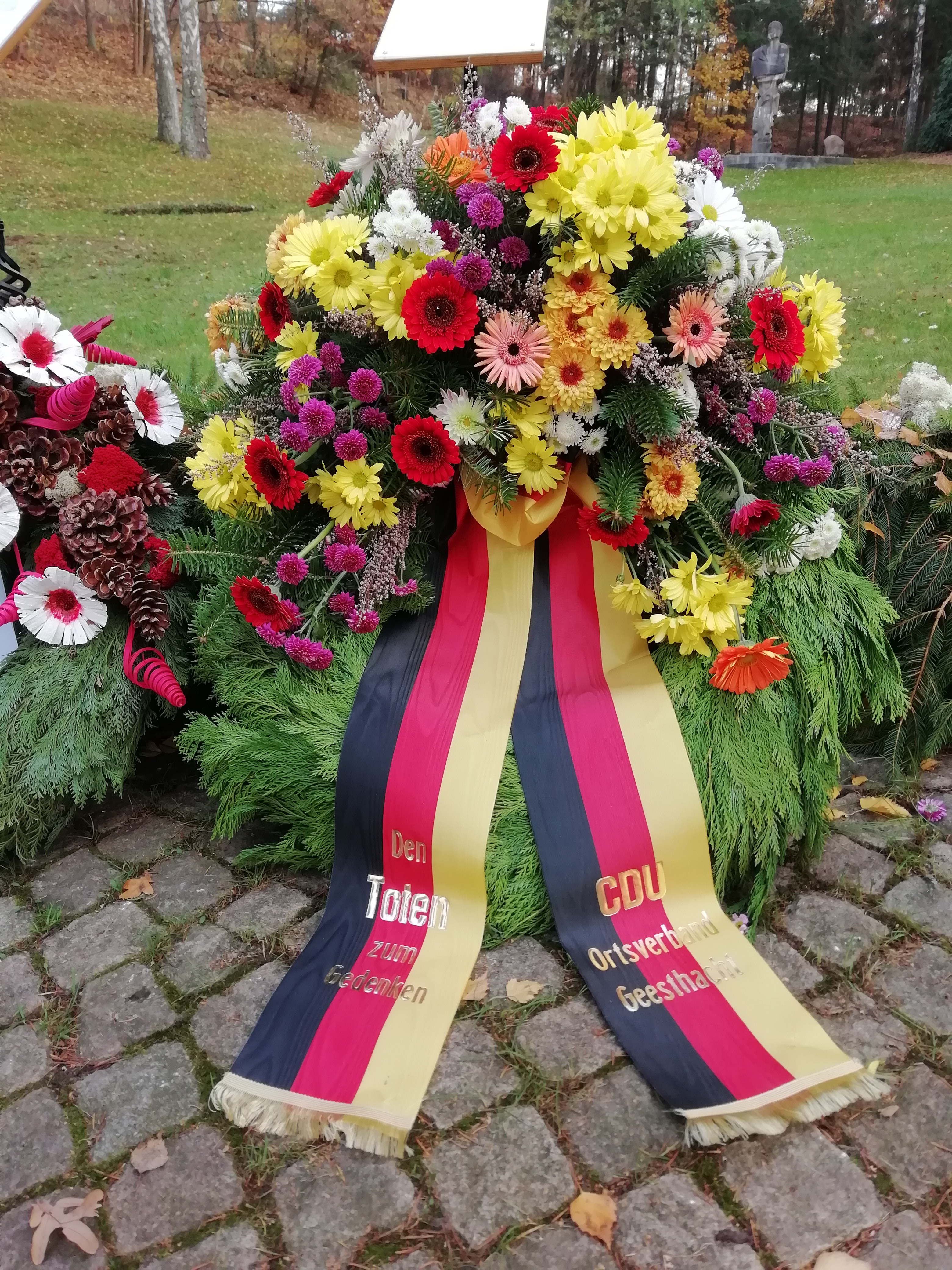 Unser Wissen um die Geschichte, die Informationen über unheilvolles Geschehen auch in der Gegenwart verpflichten uns, die Stimme zu erheben gegen Verletzungen der Menschenrechte und des Völkerrechts. Egal, in welchem Winkel dieser Erde dies geschieht. Aus diesem Grund versammelten wir uns heute am Mahnmal auf dem Waldfriedhof zur Kranzniederlegung, begleitet durch die deutsche National- und Europahymne.