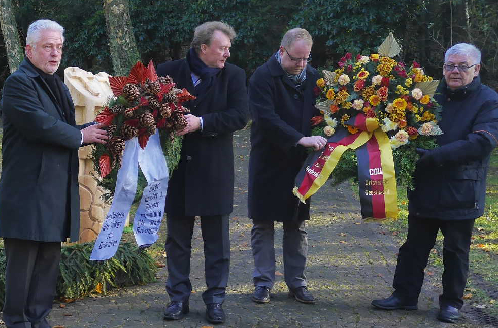 CDU-Ortsverbandsvorsitzender Michael Purwins und CDU-Fraktionsvorsitzender Sven Minge ehrten gemeinsam im Namen der Geesthachter Christdemokraten die zahlreichen Opfer mit einem eigenen Kranz. Die Stadt Geesthacht, der Volksbund und der Sozialverband Deutschland legten ebenfalls einen Kranz nieder.