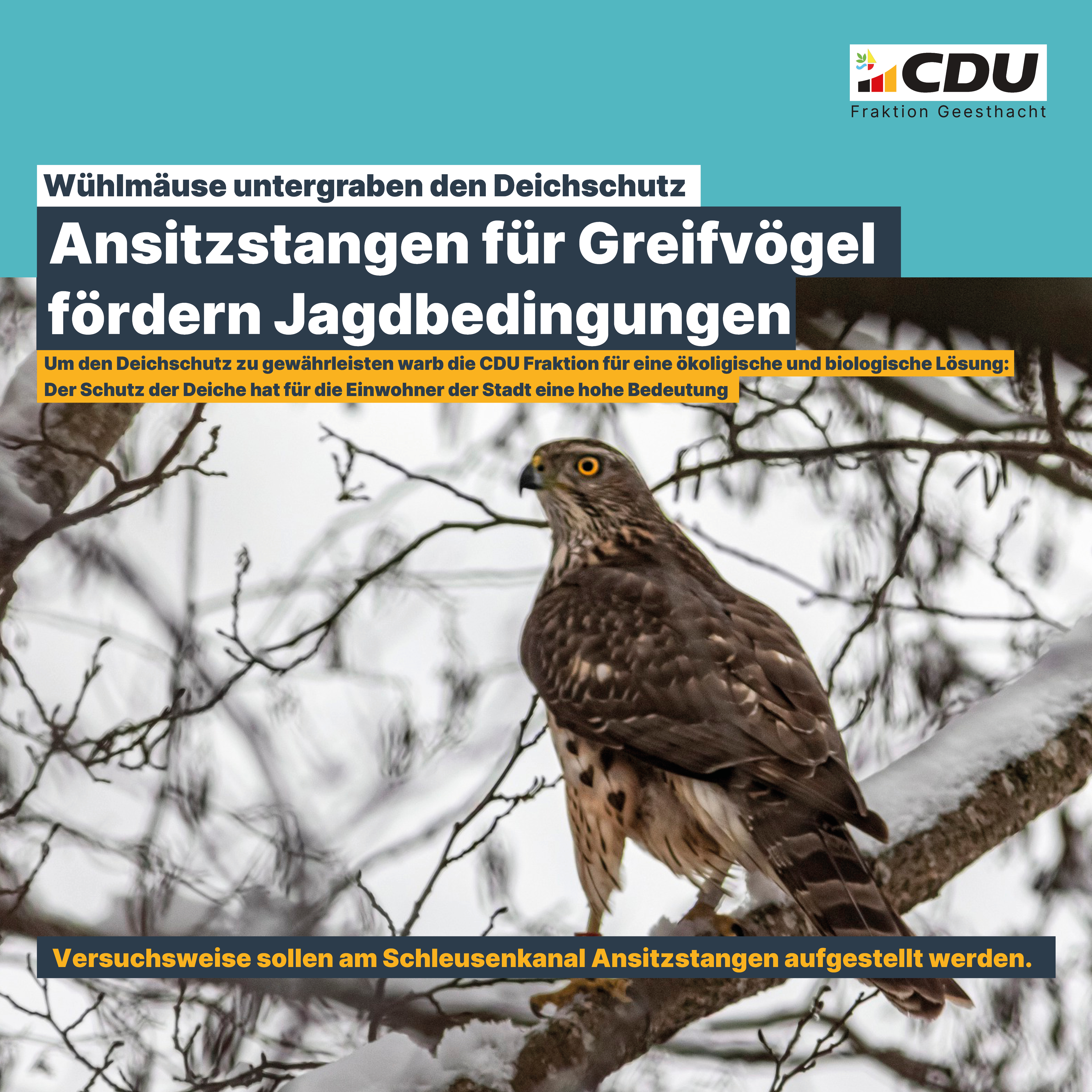 In einer Anfrage der CDU-Fraktion im Umwelt- & Energieausschuss wies Ratsmitglied Oliver Pachur auf einen starken Befall von Wühlmäusen „Am Schleusenkanal“ zwischen dem Klärwerk und der Stadtgrenze auf Geesthachts Deichkrone hin. Um den Deichschutz zu gewährleisten und gleichzeitig umweltfreundliche Methoden einzusetzen, warb Oliver Pachur für eine ökologische und biologische Lösung: Ob für die ansässigen Greifvögel bessere Jagdbedingungen zur Bekämpfung der Wühlmäuse geschaffen werden könnte, z.B. mit Ansitzstangen?