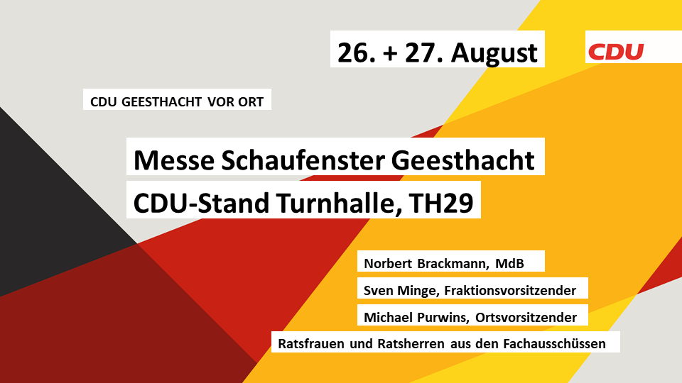 Dazu werden die jeweiligen Vertreter der Fachausschüsse persönlich vor Ort sein, zudem wird u. a. auch Norbert Brackmann (MdB) , Ortsvorsitzender Michael Purwins und Fraktionsvorsitzender Sven Minge Rede und Anwort stehen.
